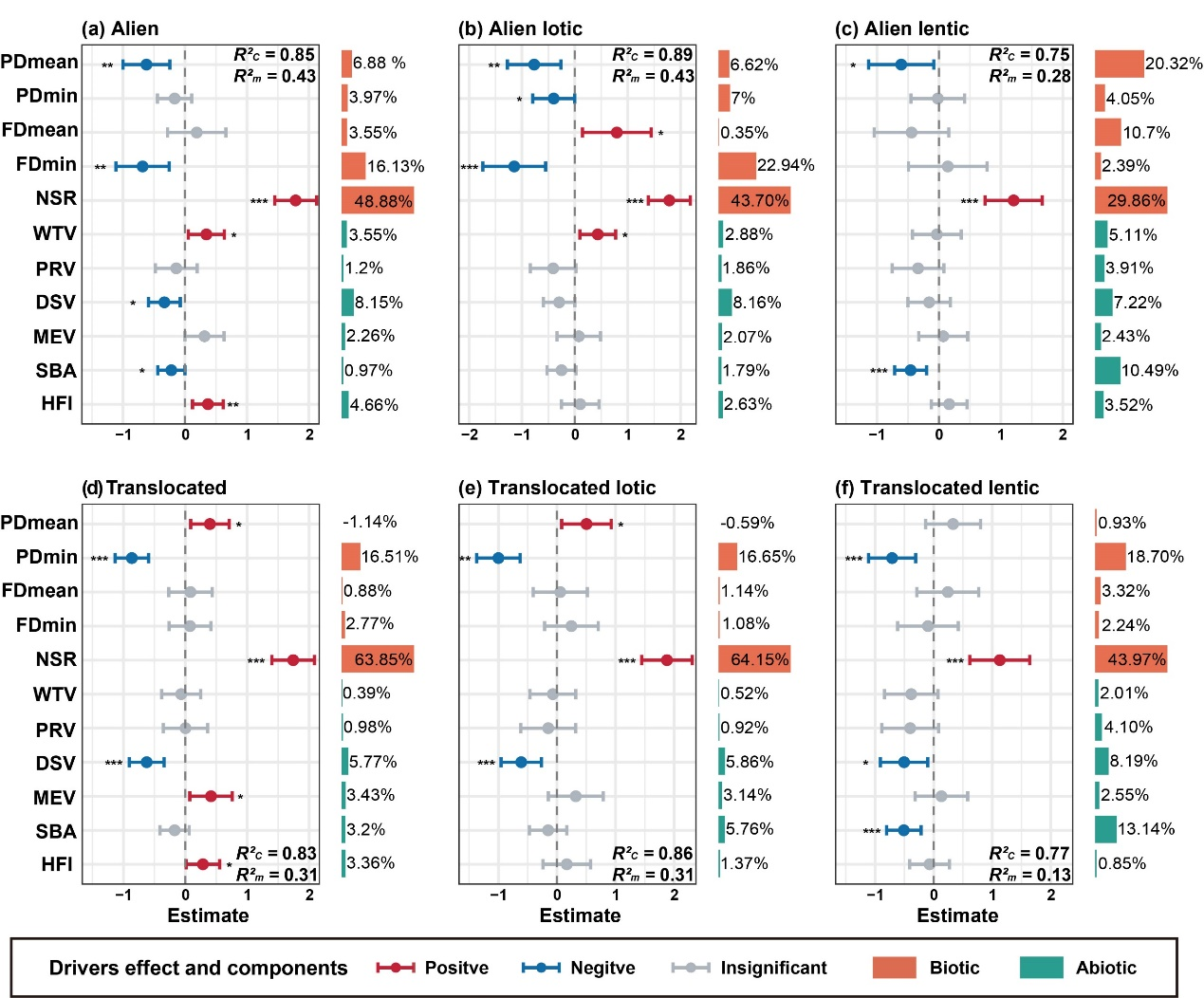 在 Reviews in Fish Biology and Fisheries 发表的研究论文《Drivers of nonnative fish invasion patterns differ by species origin and waterbody type》中,进一步解析了外来种与移植种在不同水体类型中的入侵机制。研究发现生物因子主导了非本土鱼类的入侵,解释了67–83%的入侵发生概率变化,其中土著鱼类丰富度是最关键的驱动因子;系统发育距离对入侵成功的作用模式因非本土鱼类地理来源而异,外来种更易入侵系统发育相近的鱼类群落,而移植种则相反。相较于流水系统,静水系统中非生物因子对鱼类入侵的影响更大(图3)。