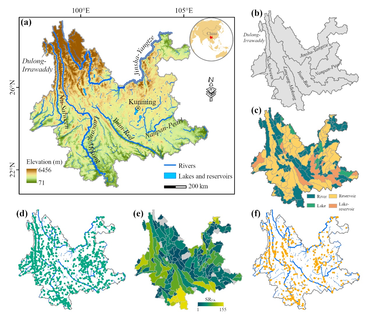 在Diversity and Distributions发表的研究论文Analysing spatio-temporal patterns of non-native fish in a biodiversity hotspot across decades中,研究团队基于长期野外调查和系统文献整理,构建了云南1950–2022年的淡水鱼类时空分布数据集(图1),共记录云南土著鱼类782种,非本土鱼类94种,包括49个外来种(alien species,云南省外引入的物种)和45个移植种(translocated species,云南省内跨流域引入的物种)。自1950年以来,非本土鱼类的丰富度不断增加,分布范围持续扩张。河流中下游为非本土鱼类分布的热点地区,湖泊与水库等静水水体更易受非本土鱼类入侵。