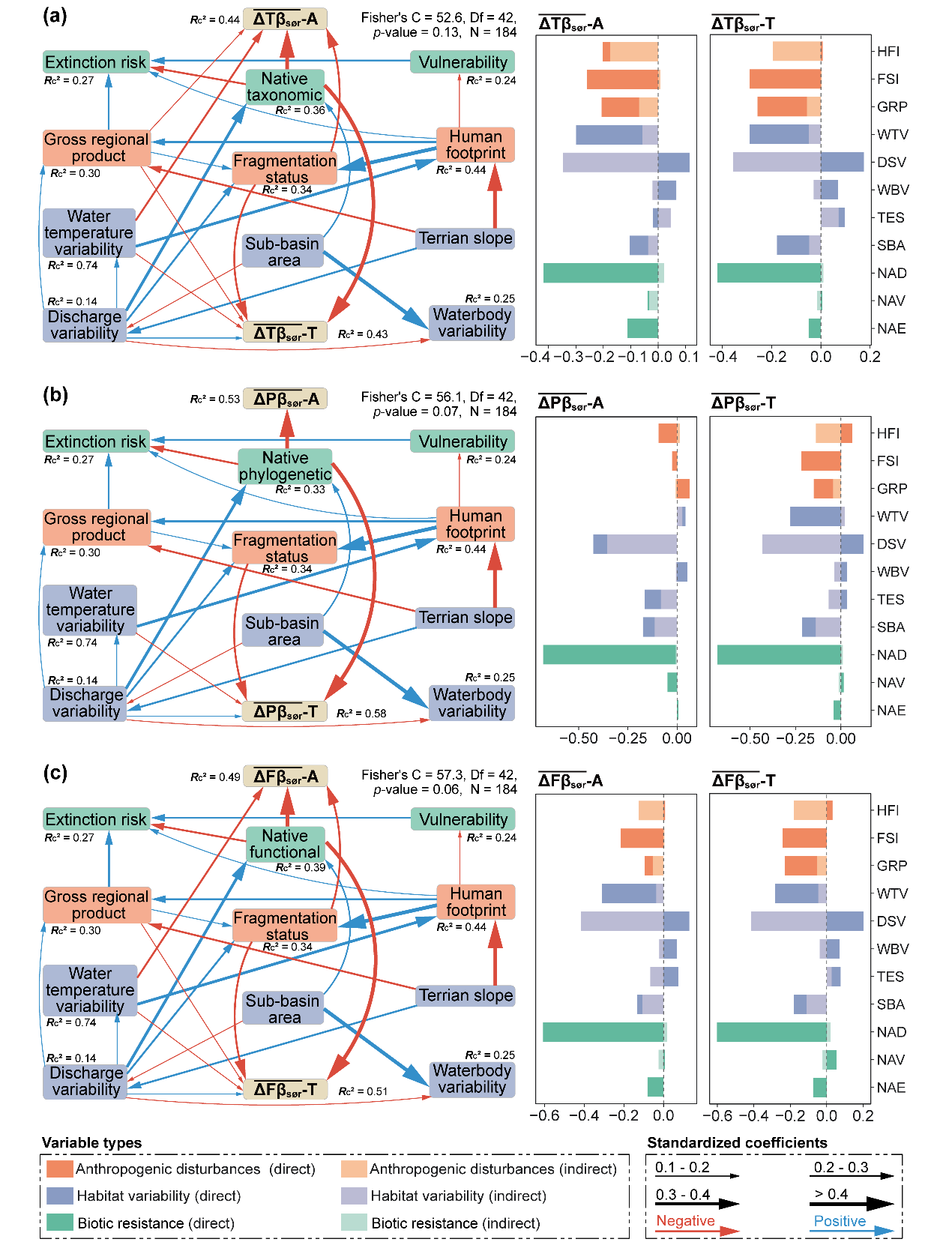 在 Global Change Biology 发表的研究论文《Translocated species exceed alien species in homogenizing freshwater fish assemblages》中,研究团队从鱼类分类、系统发育与功能三个多样性维度,量化了外来种和移植种对β多样性变化的贡献及其驱动因素。结果显示,移植种在所有多样性维度均持续驱动群落同质化,其同质化影响强度是外来种的2至4倍。人类干扰强度(如河流破碎化、经济发展)、栖息地环境变异性(如水温变幅)以及土著群落的生物抵抗力,通过直接与间接路径共同促进了鱼类群落的同质化(图2)。