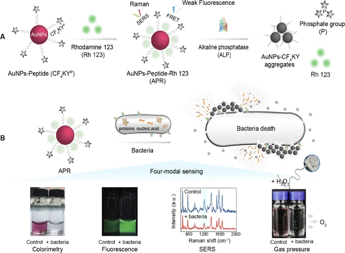 图3.AuNPs-Peptide-Rh123(APR)对鼠伤寒沙门氏菌的四模式检测与杀灭示意图