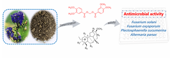长喙乌头为毛茛科乌头属植物,在我国仅分布于云南省西北部高海拔地区。由于该植物毒性较强,未在民间直接入药,但却是云南省乌头碱类成分工业化生产的重要原料之一,此前对其系统化学成分研究仍较为缺乏。为解决这一问题,2022级化学专业赵伟同学(已保送重庆大学)在校级大学生创新创业项目“应用OSMAC策略挖掘乌头内生真菌 Bipolaris cynodontis DJ-01新代谢产物 ”的支持下,开展了深入研究。该研究从长喙乌头根部中分离鉴定出一个全新化合物georgedimer以及12个已知化合物。新化合物georgedimer为3,4-二甲氧基苯甲酸通过亚甲基桥连接而成的对称二聚体,结构新颖。进一步溯源分析表明,该化合物可能是在提取分离过程中,由溶剂中二氯甲烷或甲醇氧化生成的甲醛与植物中原有的3,4-二甲氧基苯甲酸反应所形成的人工产物,提示天然产物研究中需重视分离过程可能引入的结构变化。抗真菌实验表明,georgedimer及部分二萜生物碱对四种植物病原菌具显著抑制活性(MIC 8-64μg/mL),其中化合物7对茄病镰刀菌的抑制效果优于对照药多菌灵,展现出良好开发前景(图5)。