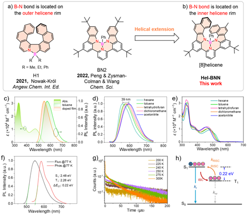 图4.π-扩展硼氮杂[8]螺烯Hel-BNN的构建及其性质表征结果
