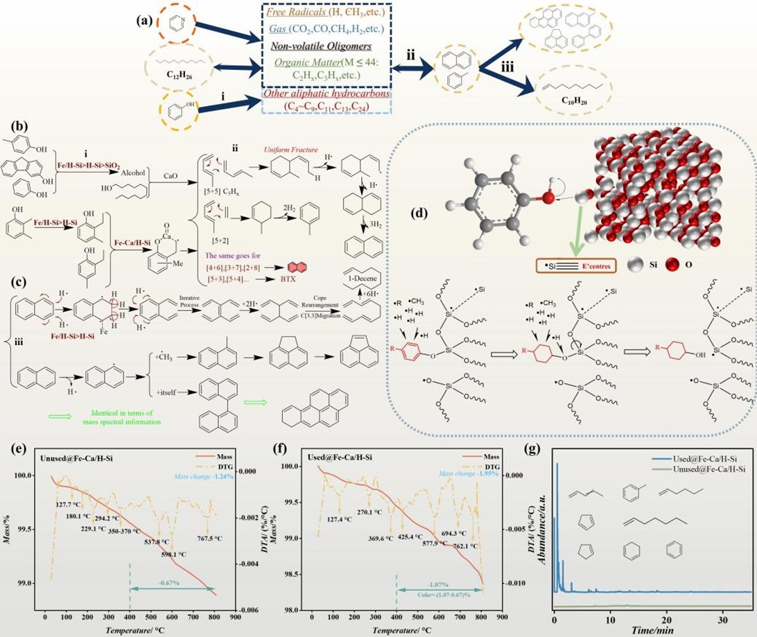 催化重整技术为煤焦油在温和条件下的高效转化提供了可行路径,然而催化剂载体结构对反应路径及产物分布的调控机制仍不明确。针对该问题,化学科学与工程学院2021级本科生尚睿航同学(现就读于中国科学技术大学)和原照然同学(现就读于中国科学技术大学)在国家级大创项目“Ni-Fe/SiO2催化煤焦油蒸汽重整制氢”(项目编号:202310673093)的支持下,通过酸处理结合浸渍法制备了Fe-Ca/H-Si催化剂,系统揭示了载体结晶度对煤焦油裂解产物分布的调控机制。项目采用HF蚀刻法调控SiO2载体的结晶度,并负载Fe与Ca成功制备了Fe-Ca/H-Si催化剂。利用热解-气相色谱/质谱联用技术(Py-GC/MS)系统分析了载体结晶度与金属负载对煤焦油在常压、无外加氢气条件下催化重整过程的协同作用机制。结合模型化合物实验,进一步探究了载体结晶度对催化性能的影响,揭示了Fe-Ca/H-Si催化剂在促进煤焦油中萘与苯酚转化过程中的作用机理。研究结果表明,酸处理破坏二氧化硅(H-Si)有序晶体结构,随结晶度降低,形成更多以E'为中心的缺陷结构,为酚类脱除反应提供活性位点。与未处理SiO2相比,采用低结晶度H-Si载体在700℃裂解时,煤焦油中酚类转化率显著提升。同时,H-Si较低的结晶度产生更大的自由体积,为Fe和Ca提供锚定位点,Fe通过促进C-C键断裂驱动萘系物向脂肪烃转化,而CaO通过改变2-乙基酚等化合物的电子分布促进其脱氧反应(图2)。