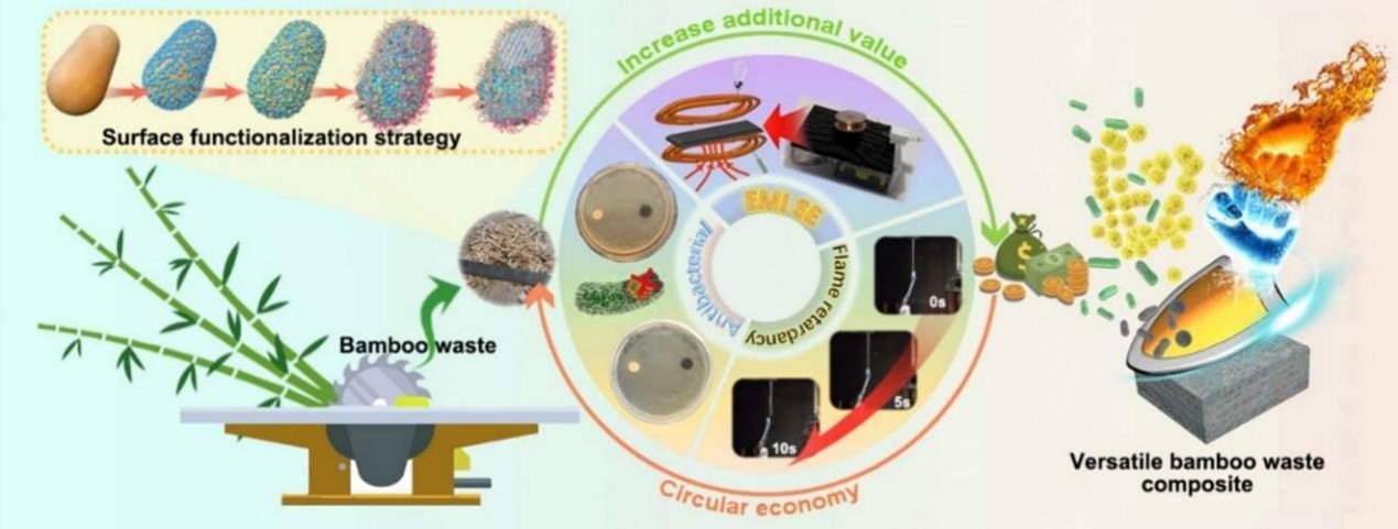研究成果以“Eco-friendly versatile shielding revolution: Tannin tailored bamboo waste composite with wave-absorbing, flame retardancy, and antibacterial abilities”为题,发表于生物大分子领域知名国际期刊International Journal of Biological Macromolecules(中科院SCI化学一区,影响因子8.5,论文链接:https://doi.org/10.1016/j.ijbiomac.2024.134162)。该论文入选2025年第十八届全国大学生创新年会,是云南大学入选本届年会的唯一学术论文类成果。王蓉、黄秋德同学为该论文的排名第一和第二的共同第一作者,刘燕、刘承阳、李嘉靓分别为论文的第四、五、六作者。