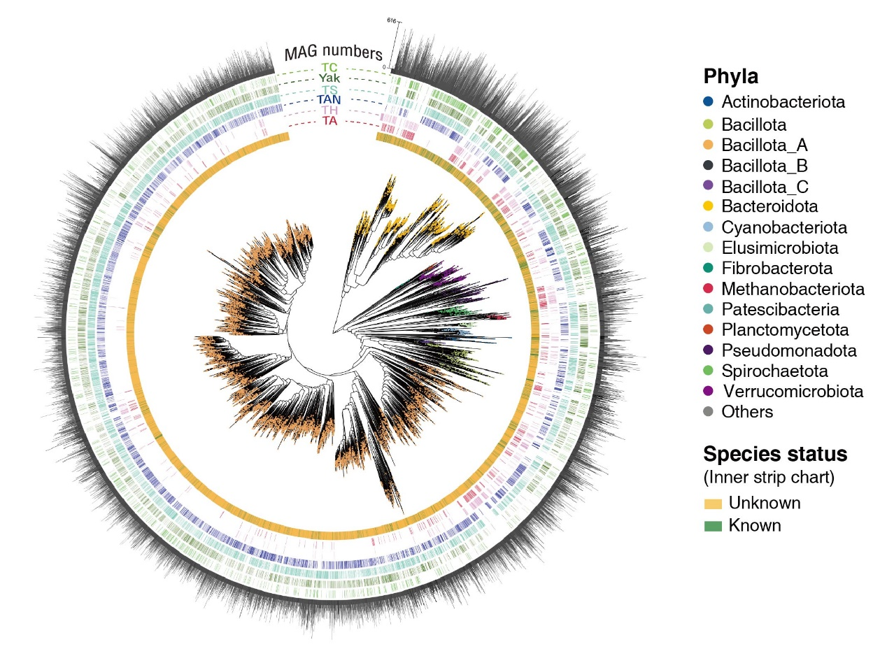 值得一提的是,该数据库所包含的微生物物种中,有高达88%的物种为以往未被认知的新物种(图2)。这项研究首次在全基因组尺度上,大规模、系统地揭示了青藏高原特有大型食草动物肠道中蕴藏的宝贵微生物资源,标志着动物肠道微生物组研究领域进入了新的阶段。该研究整合了近期张志刚研究团队在Science China Life Sciences杂志联合公布的青藏高原六个哺乳动物目14个物种(涵盖人类、家畜和野生动物)的肠道微生物参考基因组集(包括了21,902个SGB,其中86%的SGB在现有数据库中未被注释)(文章链接:https://link.springer.com/article/10.1007/s11427-025-3047-5),研究团队完成了全球首个最大规模的青藏高原动物微生物资源库的一期工程建设(https://db.cngb.org/qtp/)。该数据库可以很好地服务于后续前沿科学问题的深入探索以及特色微生物资源的深度开发利用。