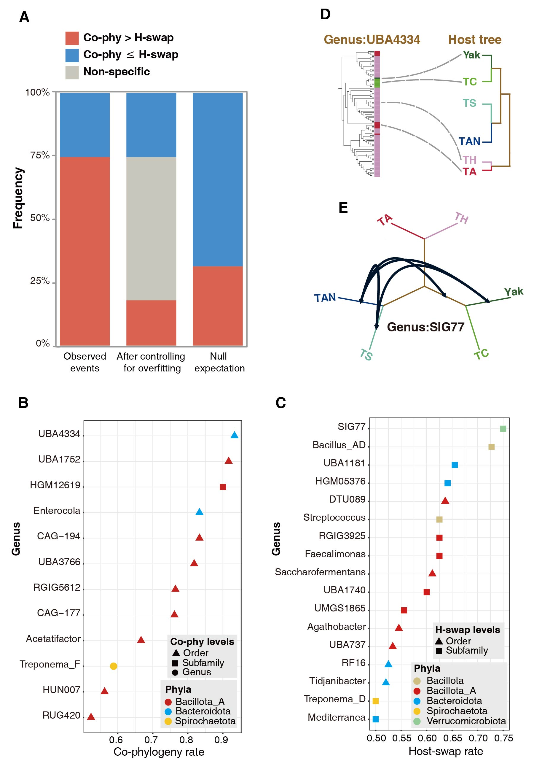 系统发育分析显示,沿宿主系统发育谱系反复发生的菌群获得与丢失事件,可能是驱动这些高原食草哺乳动物肠道微生物群组装的重要机制。对群体水平的分析进一步发现,在青藏高原生态系统中,宿主与其特定肠道共生微生物之间既存在频繁的共系统发育信号,也经常发生宿主交换事件(图3)。这标志着垂直传递和跨动物宿主之间的水平转移均为哺乳动物肠道微生物形成、维持和演化的主要驱动力,打破了之前“垂直传递”为主的学术观点。这不仅为理解动物宿主与肠道共生微生物的之间的演化关系提供了新的见解,也为今后有益微生物跨宿主应用奠定了重要的理论支撑。