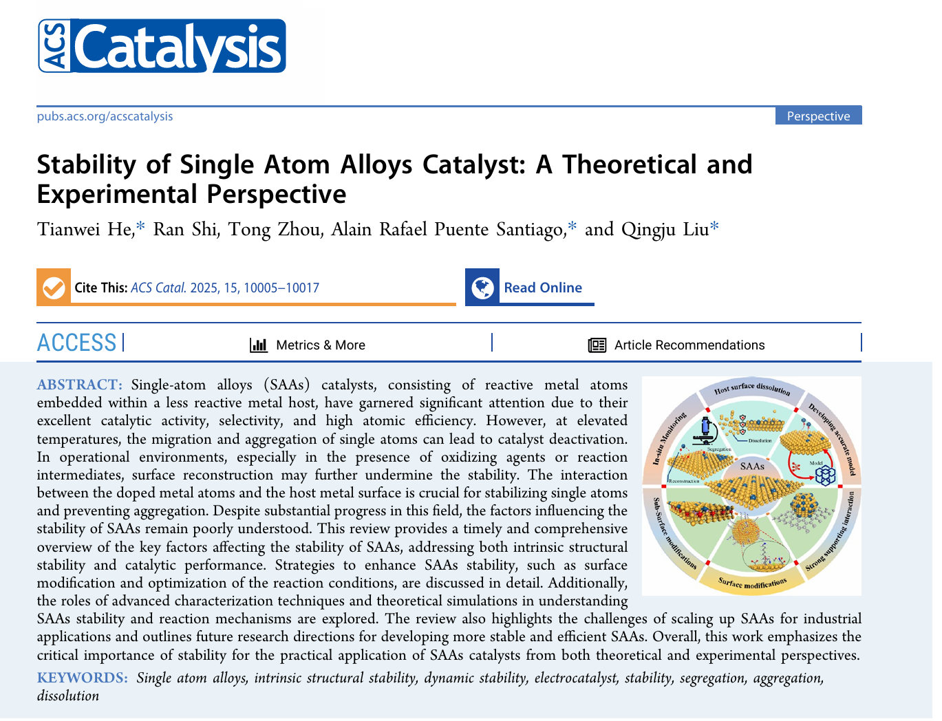 2.单原子合金(Single-Atom Alloys, SAAs)作为近年来催化科学的前沿研究热点,因其高度分散的活性位与独特的电子结构而展现出卓越的催化性能,在能源转化、环境治理及电化学反应中显示出巨大潜力。然而,稳定性问题始终是限制其走向实际应用的关键瓶颈。本综述系统总结了单原子合金在结构和催化过程中的稳定性机理,并基于最新的理论计算和实验进展提出未来研究方向。在固有结构稳定性方面,文章深入讨论了单原子在金属表面发生迁移、聚集及向体相偏析的热力学驱动力;同时对晶面、尺寸及金属组合等因素进行系统分析,为理性设计稳定SAAs 提供数据支撑。在催化稳定性方面,综述重点阐述了反应中间体(如 *CO、*H、*OH)、氧化剂及电化学环境对SAAs表面结构演化的影响,揭示了外界条件下单原子的动态行为与失活机制。此外,文章整合了多种前沿表征技术(如XAFS、HR-TEM、原位光谱)与机器学习预测模型,展示了多尺度、多手段协同解码SAAs 稳定性的研究范式。综述最后提出了加强主体金属抗溶解能力、抑制掺杂原子流失、引入强金属-载体作用以及开展原位监测等多项策略。本综述不仅为理解单原子合金的稳定性提供了系统框架,也为未来设计更高效、更耐久的单原子合金催化剂指明了方向,为绿色能源催化与新材料研发注入了新的动力。研究成果“Stability of Single Atom Alloys Catalyst: A Theoretical and Experimental Perspective ”(DOI: https://doi.org/10.1021/acscatal.5c01586 )”发表在ACS Catalysis上。云南大学为第一完成单位,云南大学材料与能源学院的何天威副教授为论文第一作者兼通讯作者,柳清菊教授为共同通讯作者。