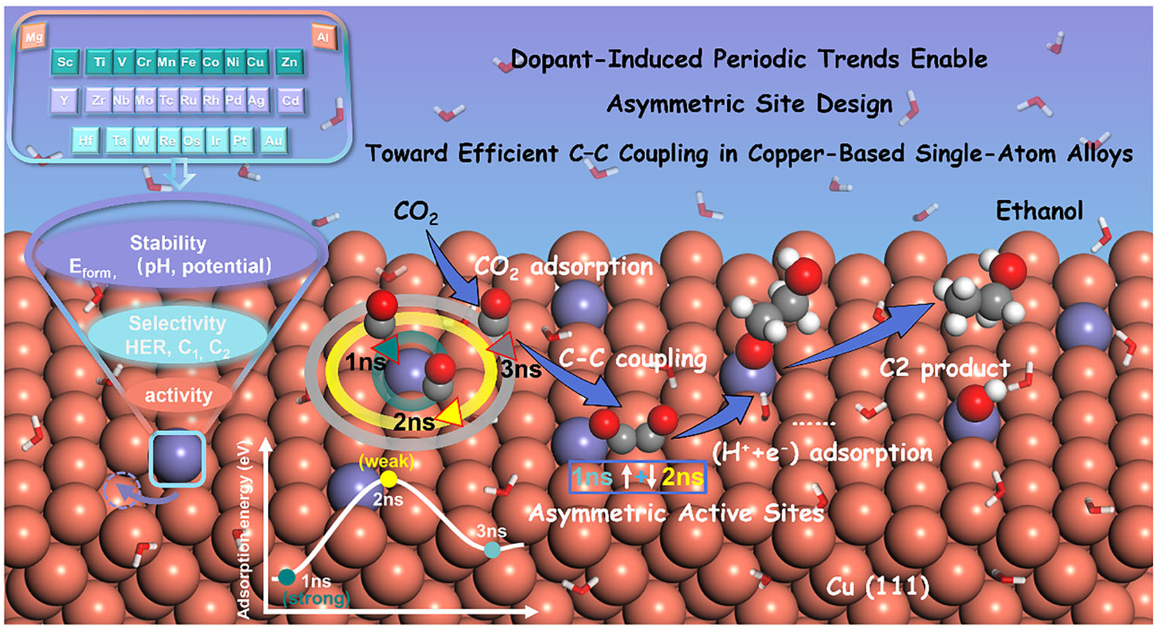 1.实现将二氧化碳高效转化为高附加值的多碳产物(如乙醇、乙烯)是构建绿色能源体系的关键难题。然而,传统铜基催化剂在选择性与能效方面均存在瓶颈。单原子合金(SAAs)因其可在原子尺度精细调控表面结构,被视为突破CO2电还原催化瓶颈的重要方向。在本研究中,我们通过大规模理论计算,系统考察了29种Cu基单原子合金,结合恒电位密度泛函理论、表面Pourbaix图与显式溶剂分子动力学模拟,揭示了一个普适且前所未见的现象:吸附强度随掺杂元素呈现“强→弱→强”的非单调周期规律。这种由掺杂原子调控的电子结构扰动,使得催化剂表面天然形成既强吸附又弱吸附的非对称活性位点,大幅促进*CO-*CO偶联,从而提升C2+产物的生成效率。基于这一新原理,我们提出了一种快速筛选优质SAAs的电子结构描述符,并成功预测出多种高性能候选,包括ScCu、VCu、ZrCu、NbCu与TaCu。其中NbCu展示出更低C-C偶联能垒与形成乙醇的可行反应路径。本研究为SAA催化剂的理性设计提供了全新的理论框架,并为推进CO2电还原技术迈向高选择性与高效率提供了重要科学依据。研究成果“From Dopant Periodicity to Asymmetric Sites: Steering C-C Coupling in Single-Atom Alloy Catalysts for Electrochemical CO2 Reduction”发表于Angew. Chem. Int. Ed.(DOI: doi.org/10.1002/anie.202520426),云南大学为第一完成单位,云南大学材料与能源学院何天威副教授为论文第一作者兼通讯作者,柳清菊教授为共同通讯作者。