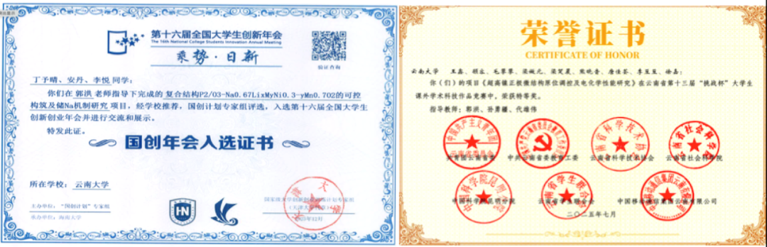 郭洪教授指导的王鑫同学,以其国家级大创项目“超高镍三元正极材料微结构调控及电化学性能研究”为基础,荣获“挑战杯”云南省特等奖。由大创项目孵化的“分级多孔石墨烯的孔径调控及其电容去离子性能研究”“Tb3+/Sm3+掺杂SrmMgnY(PO4)7的发光特性和能量传递研究”等项目,也均在国家级竞赛中斩获佳绩。这些奖项充分证明,大创项目是学生将理论知识转化为实践创新能力的核心桥梁。