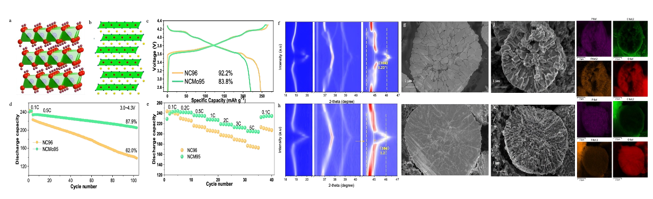 图3.LiNi0.95Co0.04Mo0.01O2正极电化学性能及形貌结构表征结果