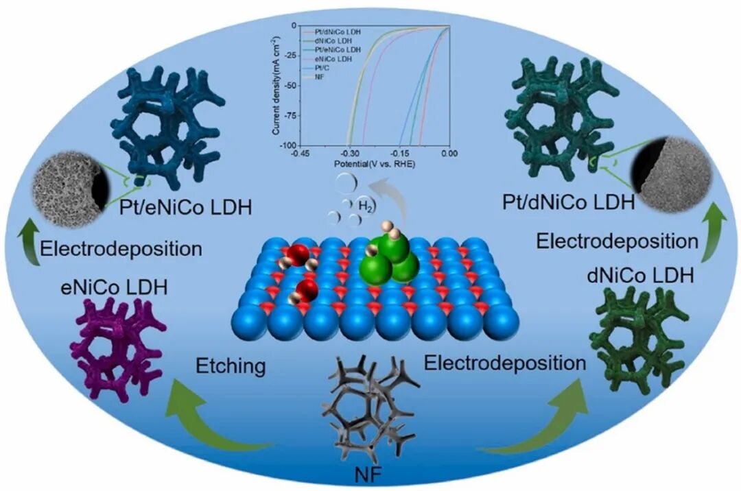图1.Pt/NiCo LDH的合成、性能及机理概括示意图