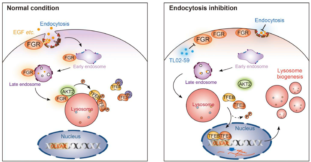 该研究揭示了一条从质膜到溶酶体再到调控细胞核转录的完整信号轴,即 FGR‑AKT2‑TFEB/TFE3通路。该通路受内吞活动动态调控:当内吞活跃、生长信号充足时,质膜定位的FGR随内吞过程转运至溶酶体,激活并招募AKT2,进而磷酸化并抑制TFEB/TFE3,从而限制溶酶体的过度生成;反之,当内吞受阻或营养匮乏时,该抑制信号被阻断,TFEB/TFE3得以活化,驱动溶酶体生物发生以增强降解与代谢回收能力。