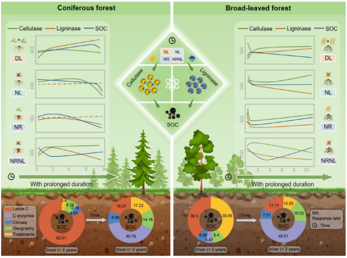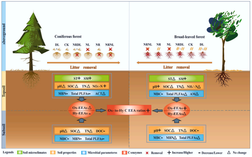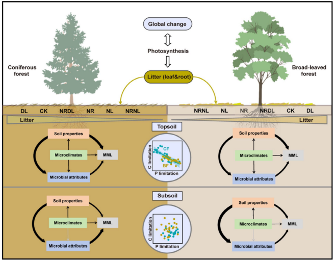 自工业革命以来,人类活动导致温室气体大量排放,加剧了全球气候变暖。森林生态系统作为全球最大的陆地碳库,储存了约45%的陆地碳,在调节气候、减缓大气CO2浓度上升等方面发挥着重要作用。目前,森林土壤碳库的稳定性正面临严峻挑战:气候变化与人为干扰(如森林疏伐、凋落物收获)共同改变了凋落物的输入数量与质量。作为土壤有机质的核心来源,凋落物分解过程高度依赖于微生物分泌的胞外酶。这些酶如同高效的“分子剪刀”,将结构复杂的植物残体分解为微生物可利用的小分子养分。然而,凋落物输入变化如何影响土壤碳降解酶的活性,以及不同林型(针叶林vs阔叶林)的调控机制有何差异,制约着我们对未来气候变化背景下森林土壤碳动态的精准预测。。