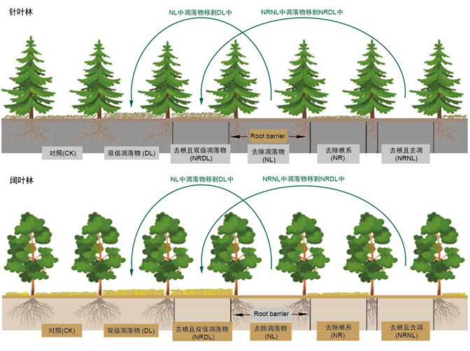 研究团队在云南玉龙雪山建立了针叶林和阔叶林的凋落物调控实验平台,设置了对照(CK)、双倍凋落物(DL)、无凋落物(NL)、无根系(NR)、无根系+双倍凋落物(NRDL)和无根系+无凋落物(NRNL)六种处理。