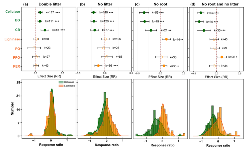 上述野外实验揭示了短期、局部的规律。这些规律是否具有普适性?研究团队进一步整合了全球的凋落物调控实验数据,进行了系统的meta分析。结果显示:在所有处理中,纤维素酶活性都是驱动土壤有机碳变化的最主要因素,相对贡献率达30.5%。凋落物添加使纤维素酶活性平均提高9.1%,但对土壤有机碳含量无显著影响;而凋落物移除(NL、NR、NRNL)分别使土壤有机碳降低13.2%、26.5%和20.4%,纤维素酶活性相应降低20.8%-34.9%。