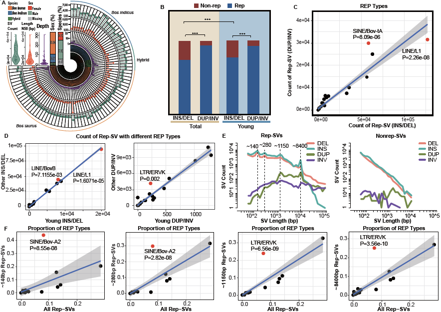 图1 家牛结构变异图谱的总体特征。A:83个家牛个体信息。B:rep-SVs和nonrep-SVs在总结构变异和年轻结构变异中的比率。C:比较介导rep-SVs的重复序列种类在不同变异类型的差异。D:rep-SVs在不同进化阶段的特征。E:rep-SVs在四个特异长度区间富集。F:重复序列种类在特异长度区间的富集情况。
