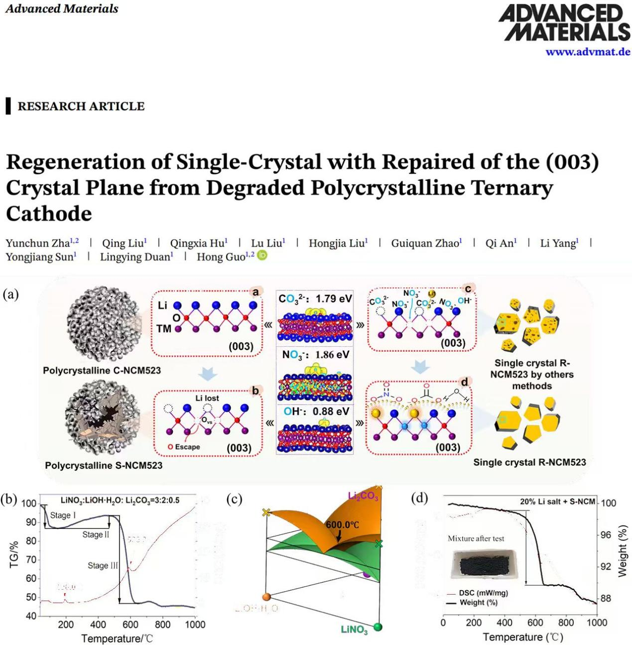 首次提出一种基于三元共晶熔盐的一步再生策略,解决了废弃多晶向单晶正极材料的转化与(003)晶面缺陷的同步修复问题。Regeneration of Single-Crystal with Repaired of the (003) Crystal Plane from Degraded Polycrystalline Ternary Cathode(论文链接https://doi.org/10.1002/adma.202523547)。博士生查云春为第一作者,郭洪教授为通讯作者。