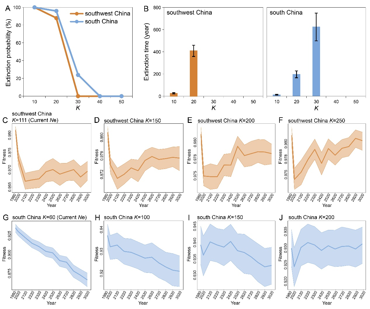 图3.中国西南部和南部穿山甲种群的动态遗传学影响