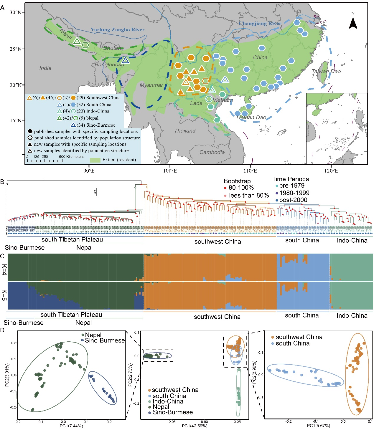本研究整合了来自博物馆和现代中国穿山甲样本的不同时间的基因组学数据,跨越种群持续下降的不同时期,探索人类活动对基因组遗传侵蚀的影响。基于对228个穿山甲基因组(133个新测序)的分析,重新厘定了中华穿山甲的种群结构,将所有个体划分为5个种群,其中4个是已经报道的种群(青藏高原南部、中南半岛种群、中国西南部和中国南部)(图2)。与之前的研究相比,通过整合更多来自青藏高原南部的新生成样本,种群结构分析显示了一个重要的发现,青藏高原南部种群进一步分化为两个不同的亚种群:尼泊尔亚种群和中缅亚种群(图2B-2D)。