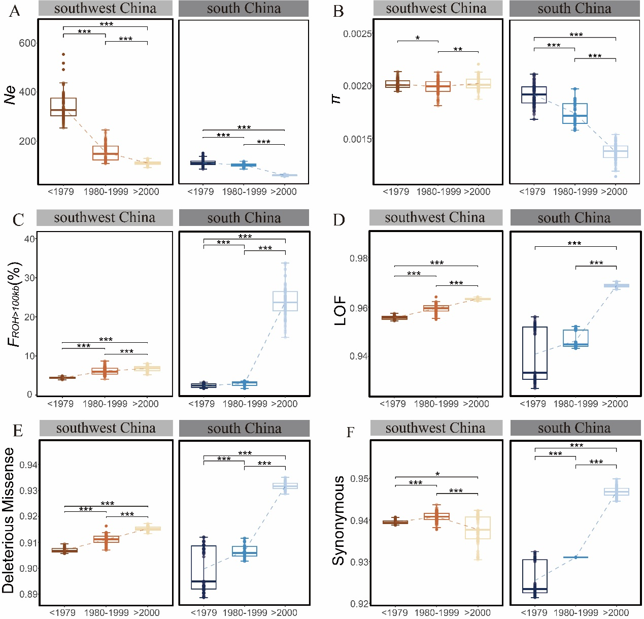 总之,本研究通过将来自博物馆和现代中华穿山甲样本的时间动态基因组学数据相结合,揭示了人类活动对基因组遗传后果的动态变化影响是直接且一致的,但复杂之处在于多个因素(历史的自然选择强度、种群数量的减少程度、种群减少的持续时间和严重程度以及个体的响应或适应能力)相互作用并相互叠加以产生结果的过程。尽管种群间的遗传后果与种群减少的严重程度直接相关,但种群内部的差异主要由历史的有效种群规模决定,而非种群减少的强度。至关重要的是,中国南方种群显示严重降低遗传多样性、较高的近交程度和更大灭绝风险,比中国西南部种群更为突出,这要求优先进行保护。这项工作为基于科学地开展极度濒危物种的保护建立了框架。