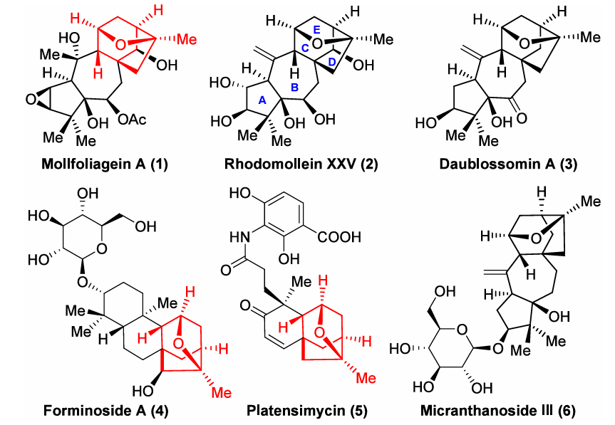 木黎芦烷型二萜(Grayanoid Diterpenes)广泛存在于杜鹃花科属(Rhododendron)植物中,具有广泛的镇痛、抗炎、抗病毒及离子通道调节等生物活性,目前已分离鉴定出超过400个天然产物。结构上,此类天然产物具有5/7/6/5四环碳骨架,C/D环构成特征的双环[3.2.1]辛烷桥环骨架,属于四环二萜。其中有极少数化合物在C11和C16位之间形成跨环氧桥,产生了额外的E-环,使得C/D环转变为更为复杂的笼状“氧杂三环[3.3.1.03.7]壬烷”(图1红色部分)。该笼状结构作为潜在的药效团存在于具有显著镇痛活性的对映-贝壳杉烷二萜Forminoside A(化合物4)和著名的抗生素“平板霉素(Platensimycin, 化合物5)”的分子结构中。目前仅有4个带有该结构单元的木黎芦烷得到鉴定(化合物1~3,6),且它们在自然界中的丰度极低,获取难度大,限制了其进一步的生物活性研究。因此需要发展一条简洁高效的化学合成路线,并从中大量获得天然产物及结构类似物,可为后期的药物化学研究打下坚实的物质基础。