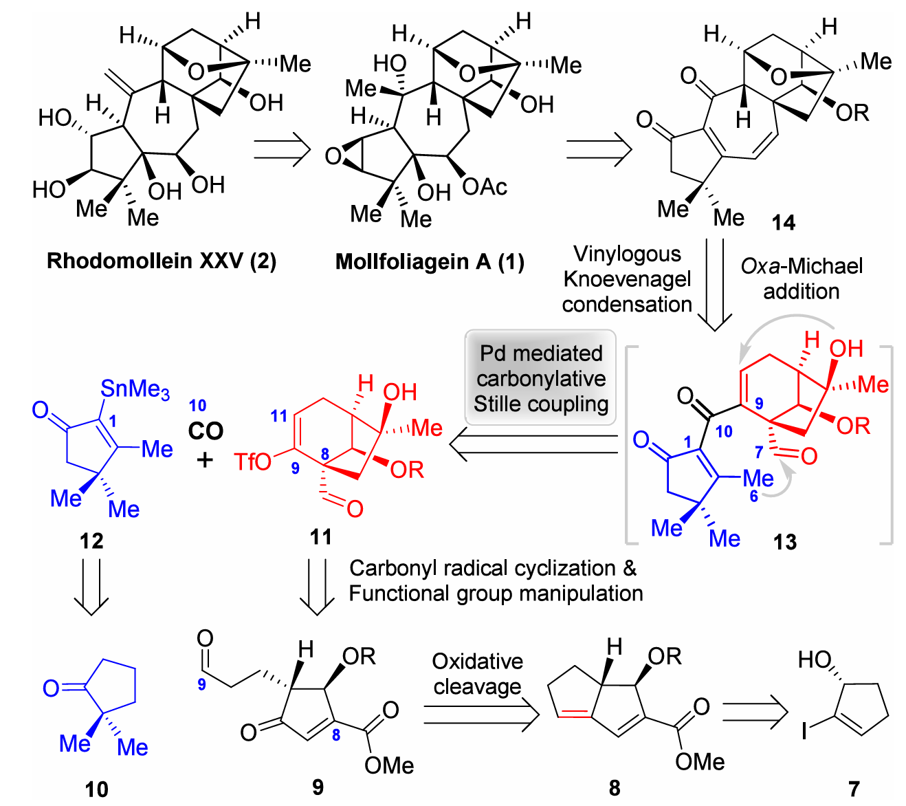 Mollfoliagein A(1)为其中结构最为复杂的成员,其碳骨架上密集排布着包含羟基,醚键,酰氧基,环氧在内的多个含氧官能团,具有极高的氧化态,其20个骨架碳原子中存在12个连续的手性中心,其中8个为含氧手性中心,3个为手性季碳中心。Rhodomollein XXV(2)与Mollfoliagein A(1)具有潜在的生源合成关系,其A/B环结构中紧密分布着4个邻近的羟基。两个天然产物均具有极高的合成挑战性。