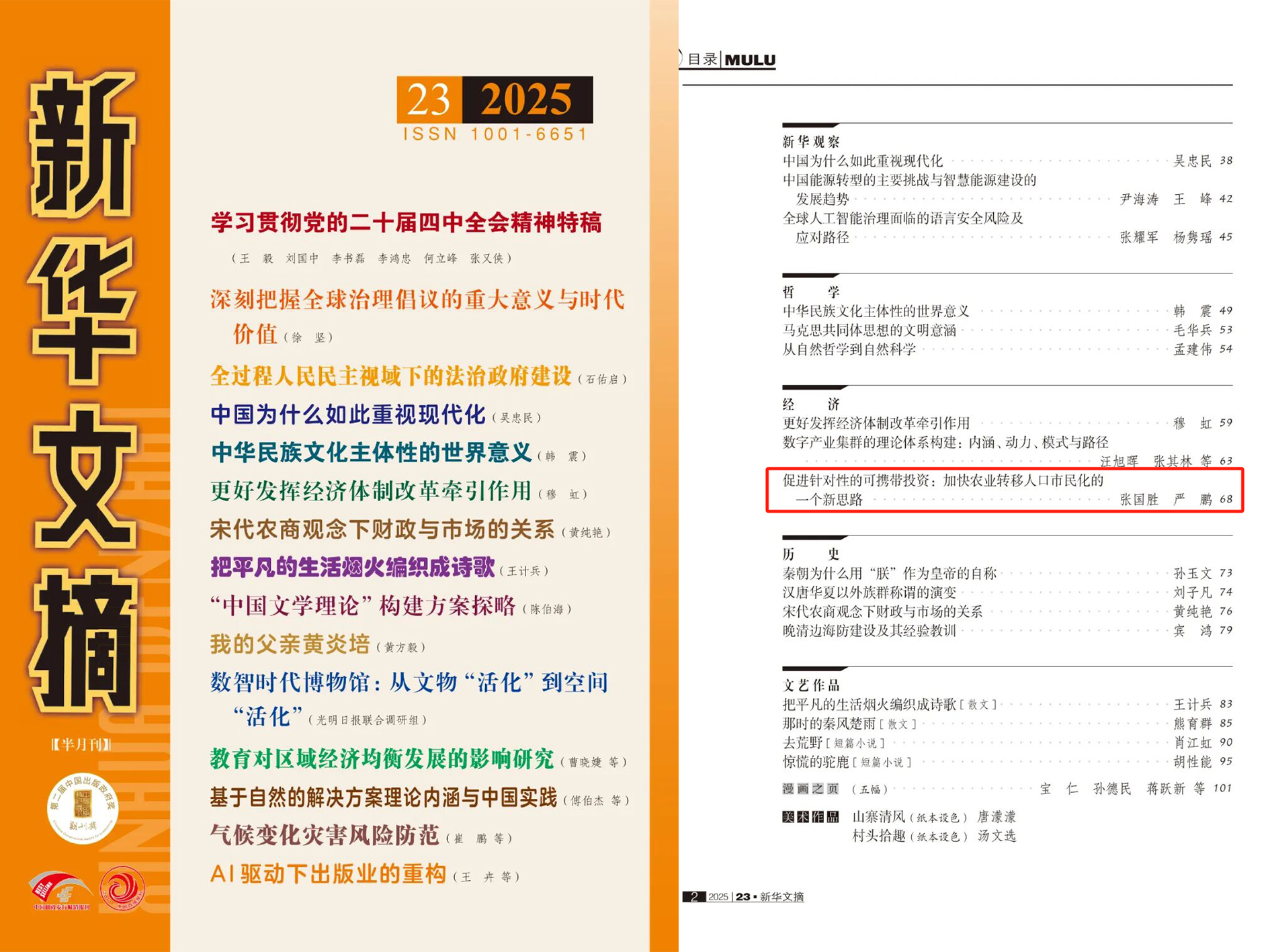 近日,《新华文摘》2025年第23期全文转载云南大学经济学院张国胜团队论文《促进针对性的可携带投资:加快农业转移人口市民化的一个新思路》。该文原发表于《中国农村经济》2025年第9期。