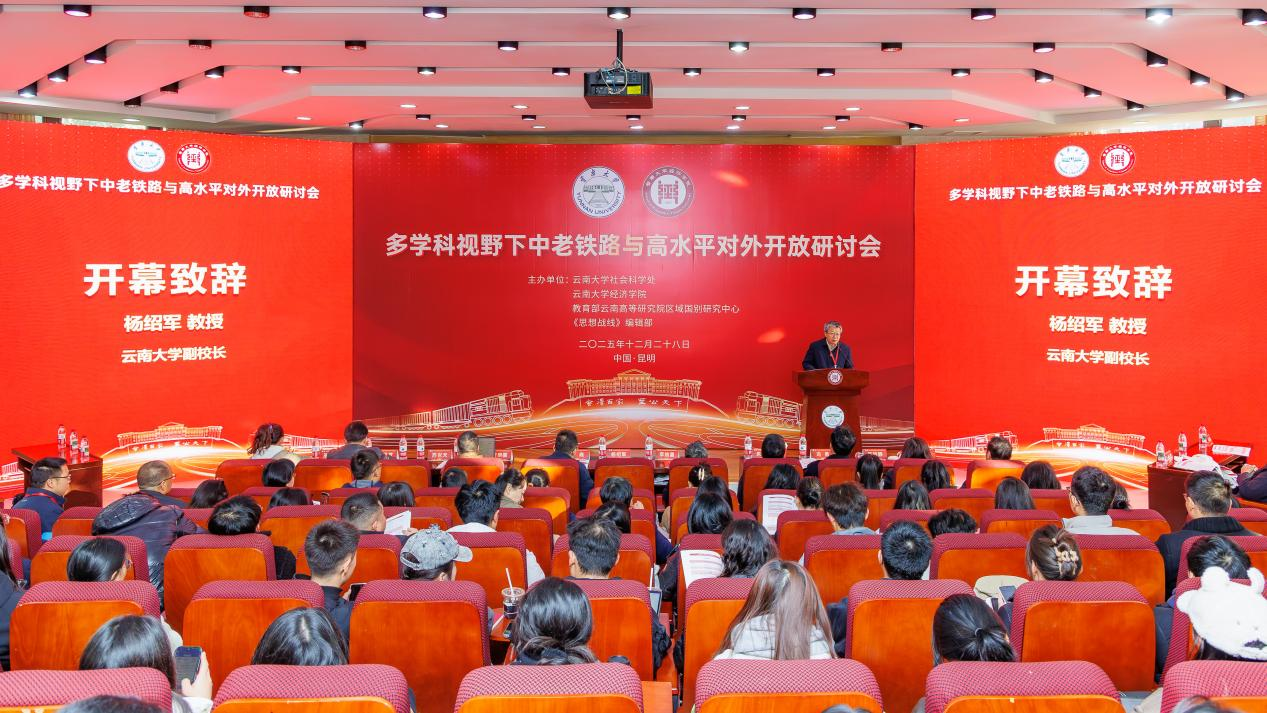 2025年12月28日,“多学科视野下中老铁路与高水平开放研讨会”在云南大学举行。本次研讨会由云南大学社会科学处、云南大学经济学院、教育部云南高等研究院区域国别研究中心、《思想战线》编辑部共同主办。来自国内高校、科研机构、政府部门及相关行业的50余名专家学者,围绕中老铁路在推动高水平对外开放中的多维价值、现实挑战与未来路径等议题展开深入研讨。云南大学副校长杨绍军在开幕式上致辞,社会科学处处长高巍主持开幕式。