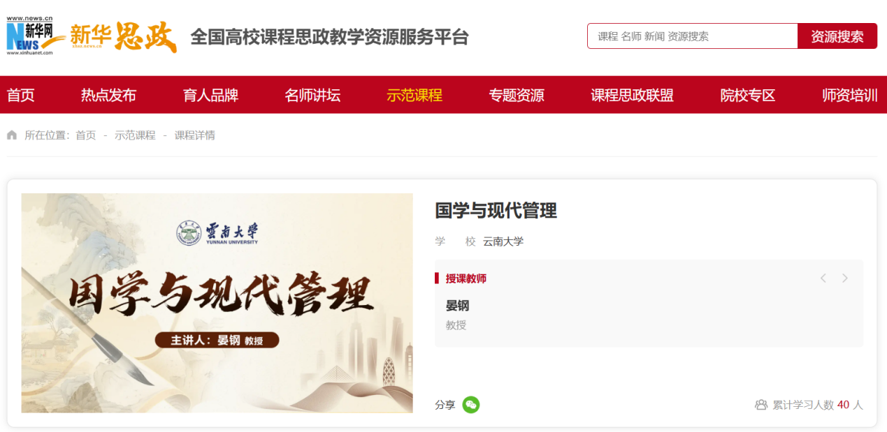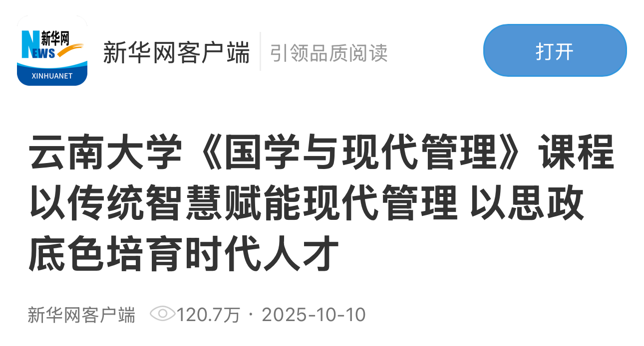 学院由晏钢老师主讲的《国学与现代管理》课程采用“案例教学+情景研讨”模式,让学生在历史与现实的碰撞中理解管理本质。学生在评教中反馈该课程“既解答了‘现代管理如何扎根中国土壤’的困惑,更让人读懂了传统文化中的家国情怀与责任担当”,体现了“知识传授”与“价值引领”的双重育人效果。近日,该课程作为教育部课程思政示范项目的一部分,新华网“新华思政”栏目对课程如何将中华优秀传统文化与现代管理实践相结合,以及如何实现思政育人与专业教学的深度融合进行了报道。