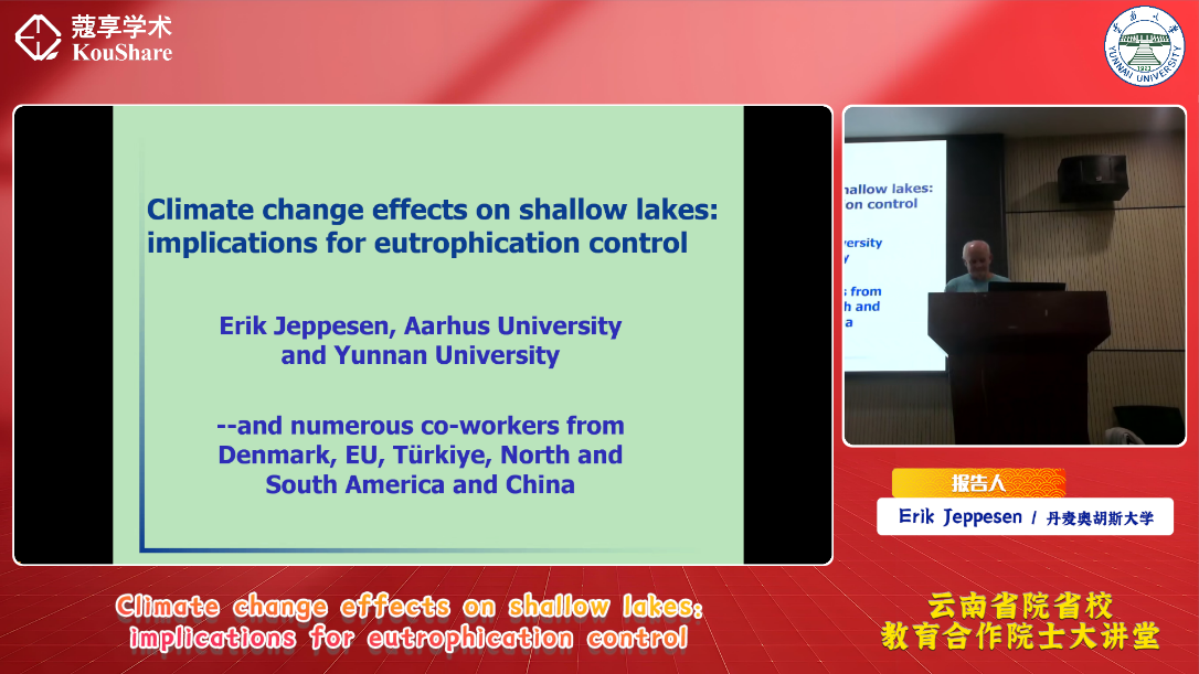 2025年10月16日,云南省省院省校教育合作“院士大讲堂”于云南大学举行。国际知名湖泊学家、丹麦奥胡斯大学教授、云南大学客座教授、云南省院士工作站专家Erik Jeppesen,以“Climate change effects on shallow lakes: implications for eutrophication control”为主题作了精彩报告,为广大师生及科研人员呈上一场学术盛宴,线上线下共计五千余名听众聆听了讲座。