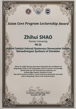 2025年11月28-30日,“第十八届亚洲尖端有机化学前沿国际研讨会(The 18th International Conference on Cutting-Edge Organic Chemistry in Asia)”在海南举行,我校化学科学与工程学院/自然资源药物化学教育部重点实验室邵志会教授获得“亚洲核心计划讲座奖(Asia Core Program Lectureship Award)”,以表彰其在有机合成化学领域,尤其是不对称催化合成领域作出的杰出贡献。